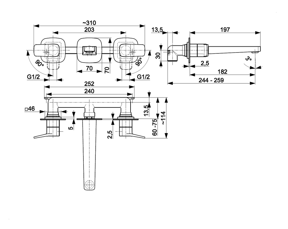 MALAGA BLACK bateria umywalkowa 3-otworowa ścienna