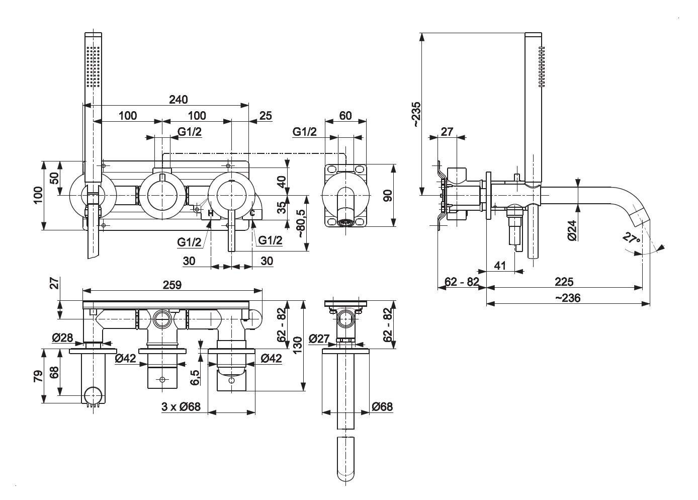 MOZA CHROM zestaw wannowy podtynkowy z baterią 3-otworową 2-funkcyjną